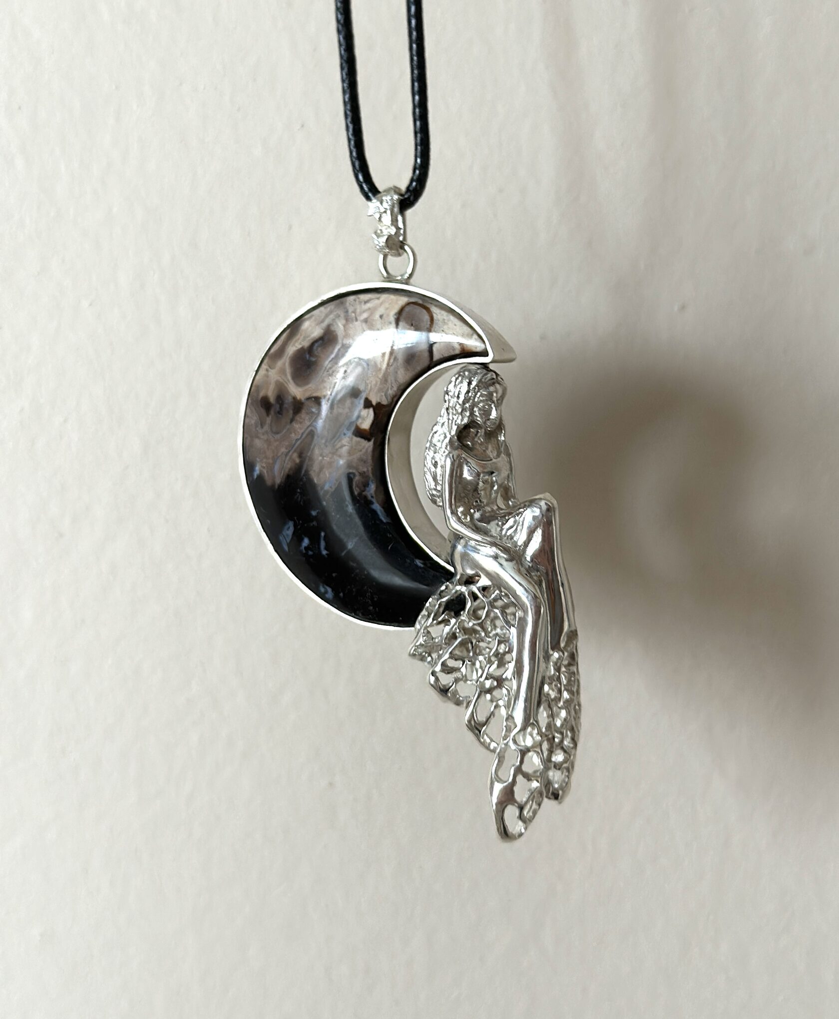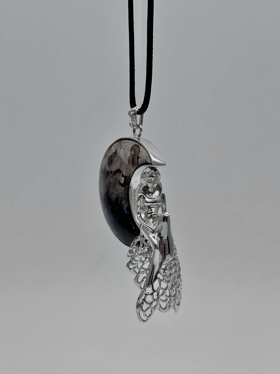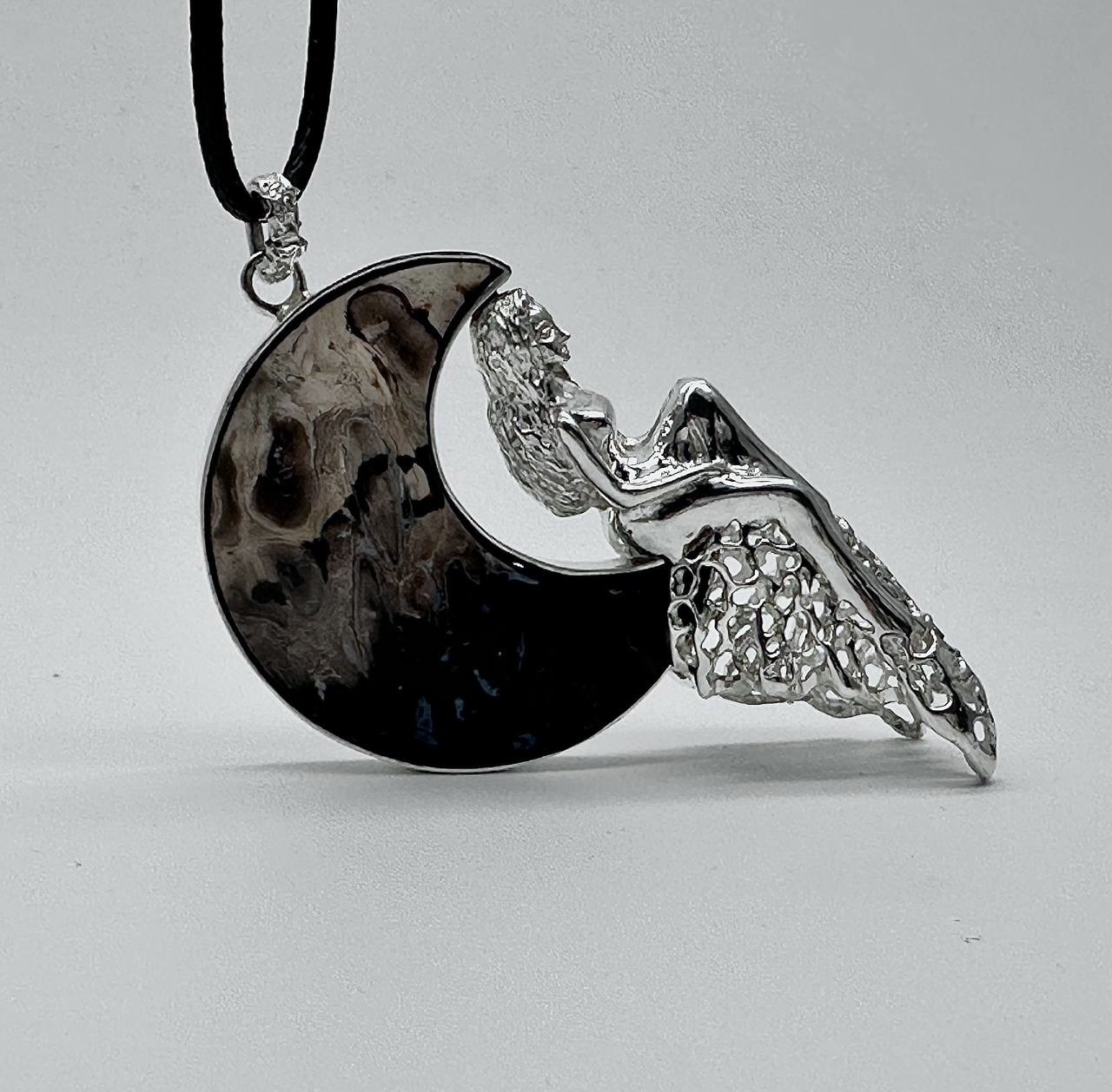 Ажурная подвеска в форме девушки, сидящей на луне. Камень - окаменелый корень пальмы — уникальный минерал, который образовался из окаменелых останков древних пальм. В процессе окаменения органические ткани замещены агатом и халцедоном.