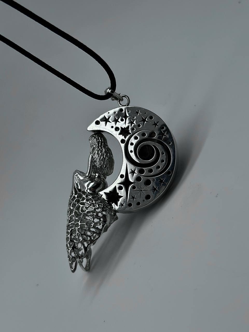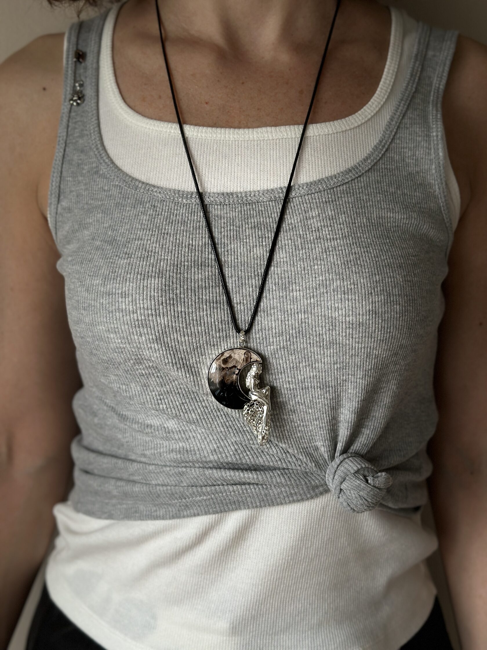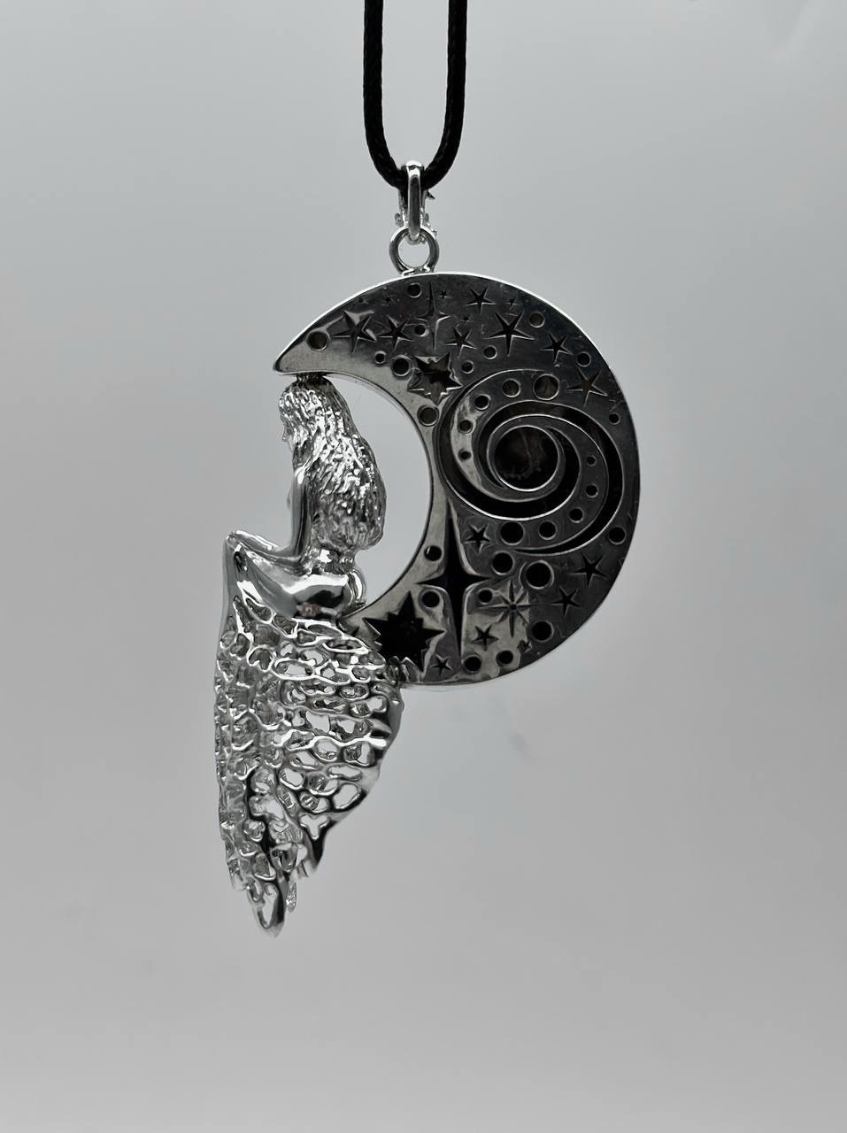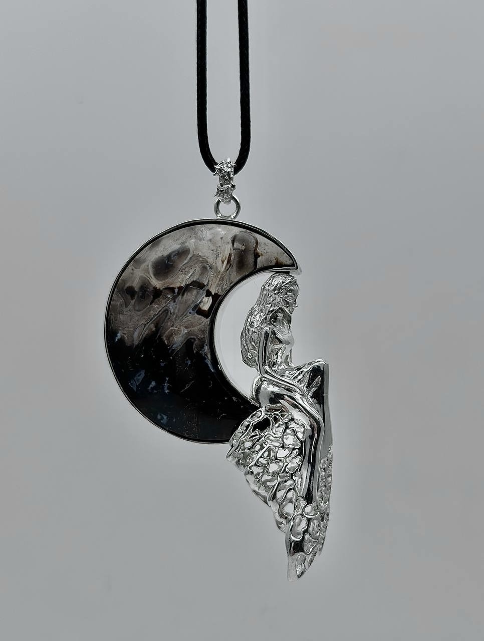 Ажурная подвеска в форме девушки, сидящей на луне. Камень - окаменелый корень пальмы — уникальный минерал, который образовался из окаменелых останков древних пальм. В процессе окаменения органические ткани замещены агатом и халцедоном.