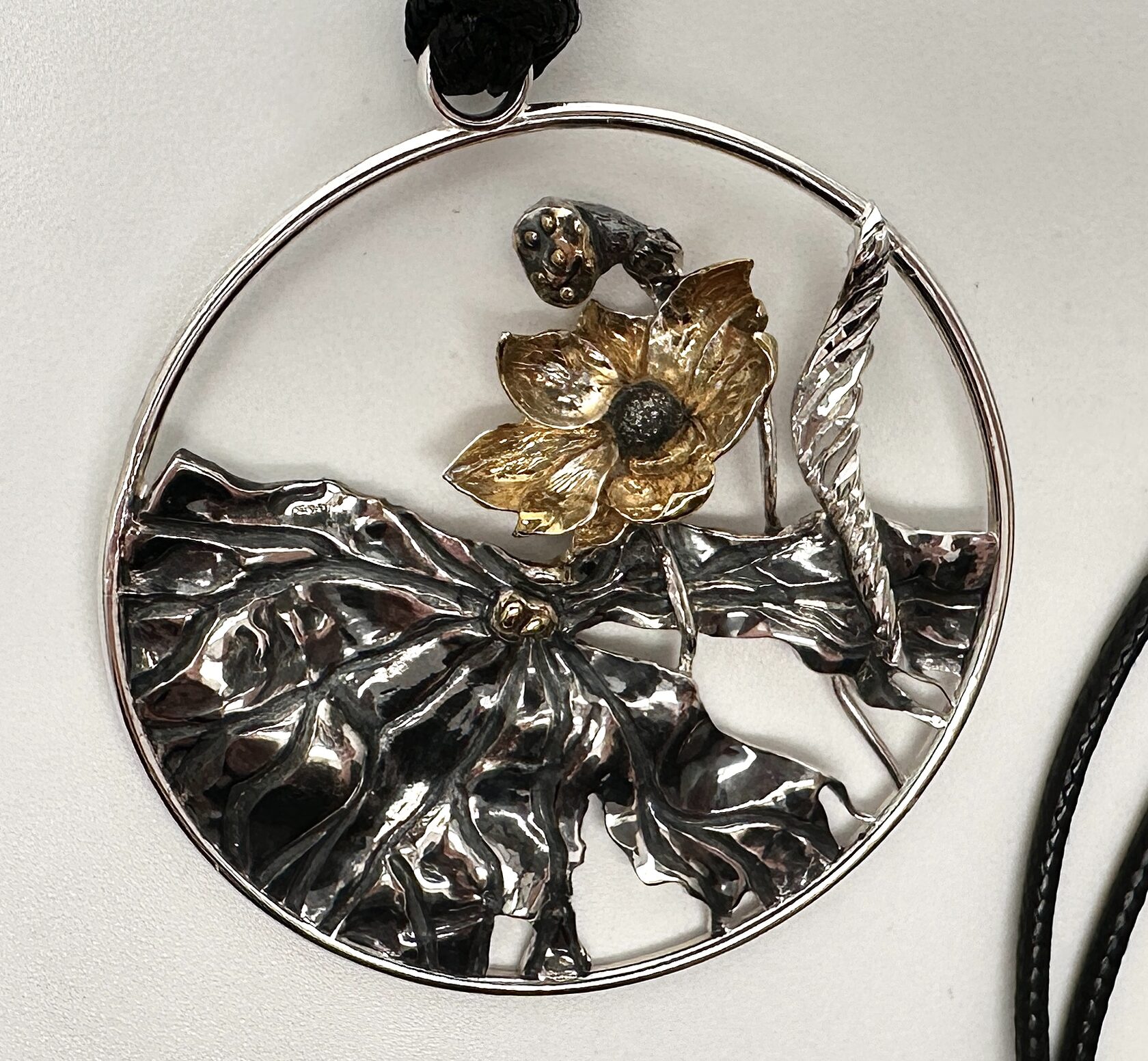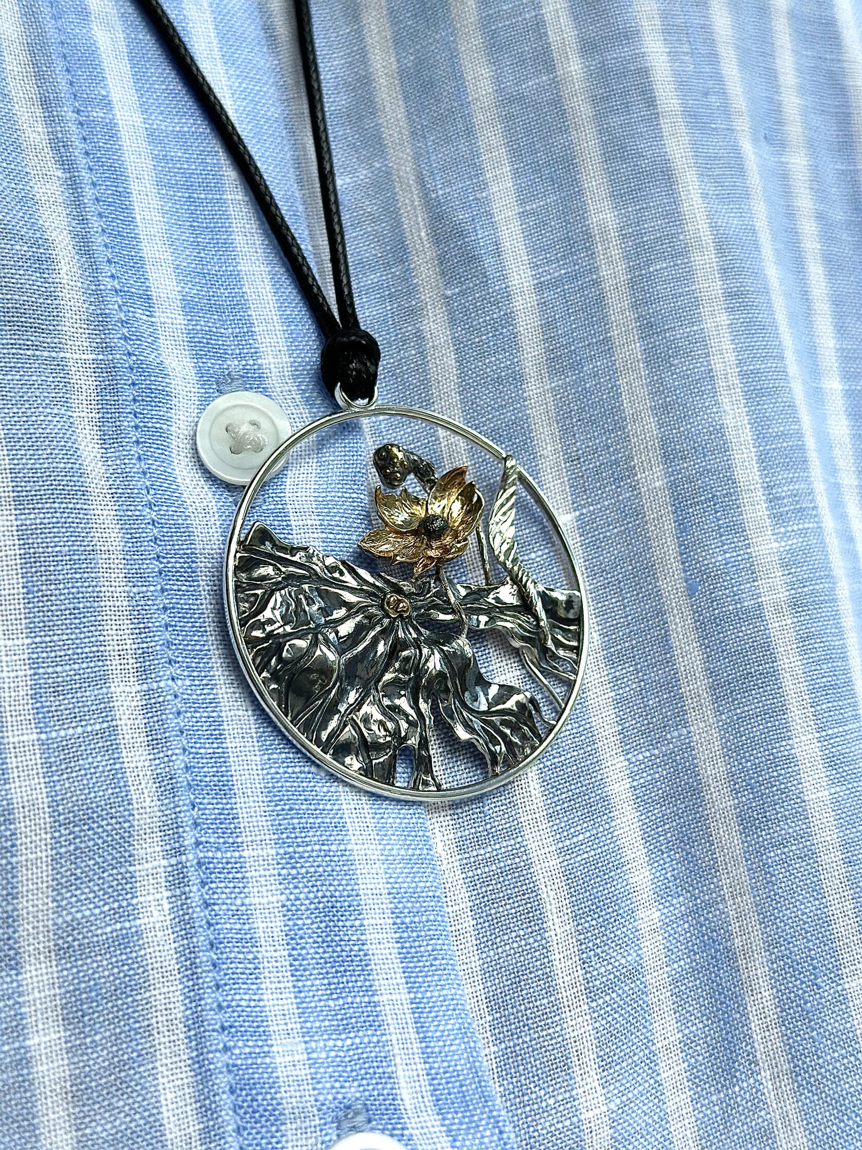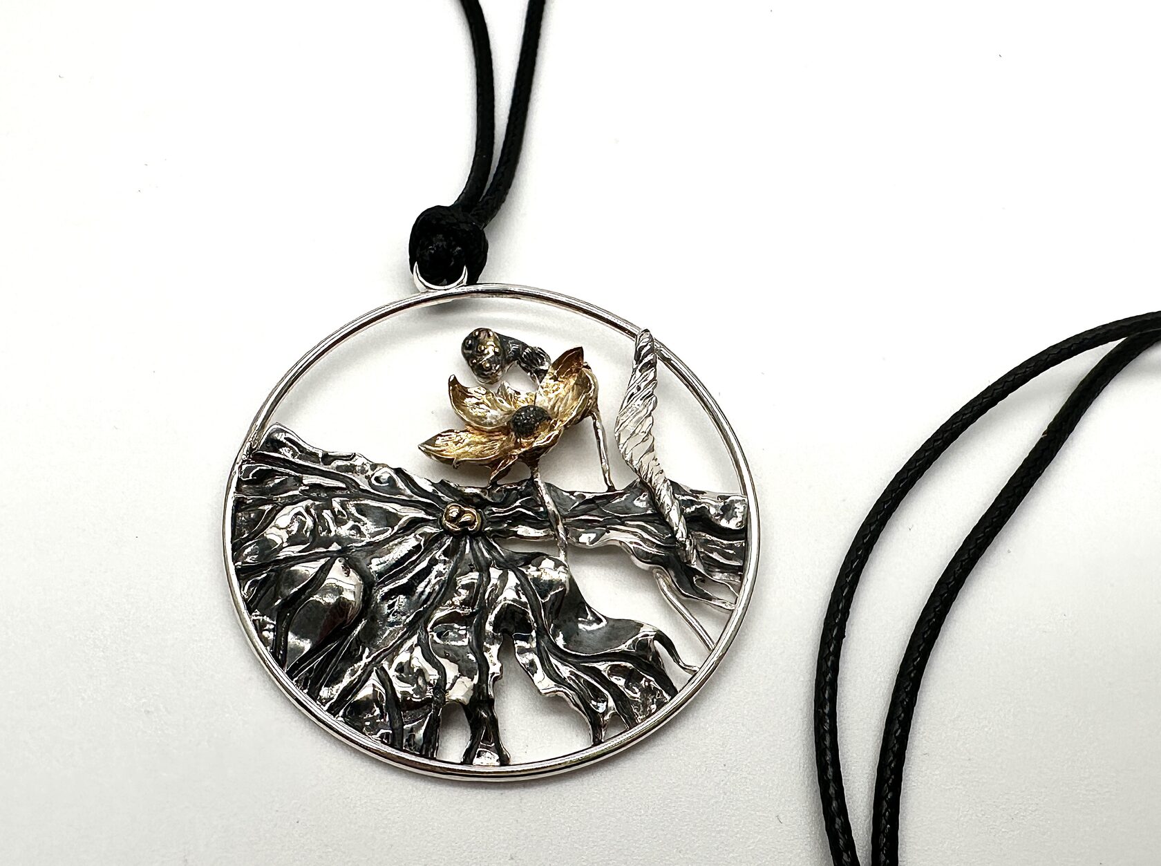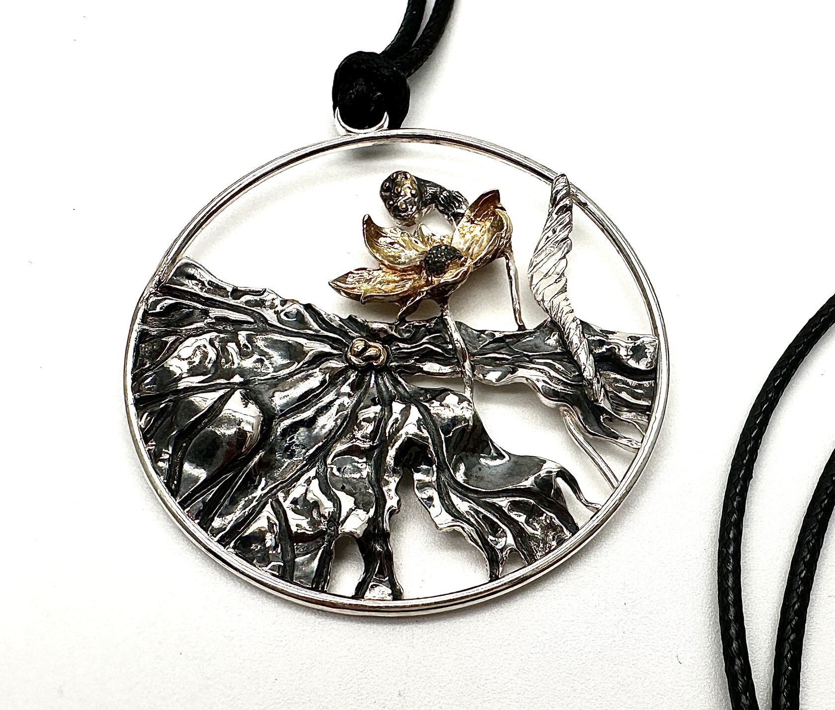 Подвеска круглой формы с изысканным цветочным дизайном в позолоте и с чернением. Эта подвеска станет не только стильным аксессуаром, но и символом гармонии и красоты, которую природа дарит нам каждый день.